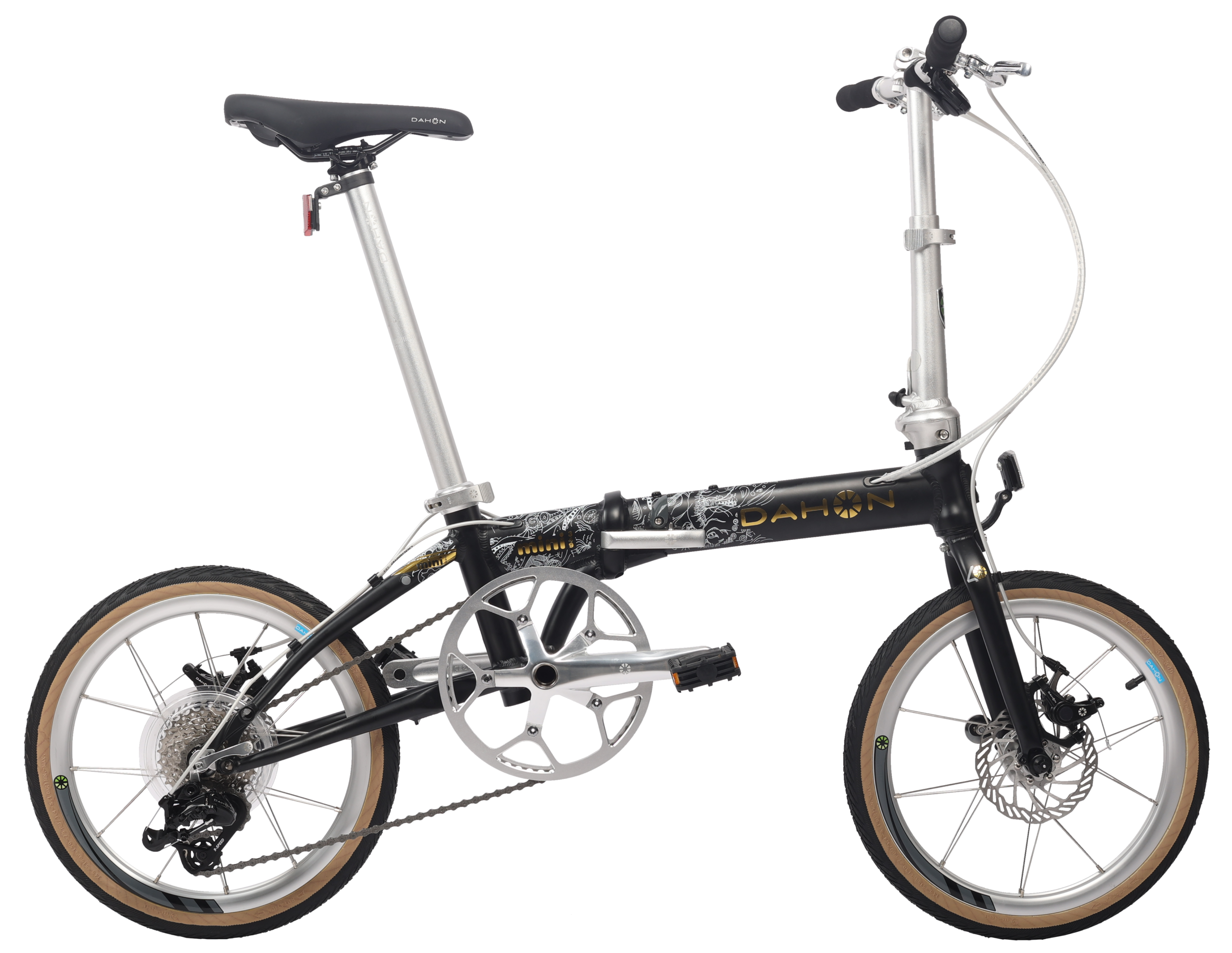 | Drivetrain | Cranks DAHON Custom 55T x170 mm, Super Light Bottom Bracket Integrated Chain KMC Z9 Cassette Sunrace 9 Speed, 11-28T Front Derailleur n/a Rear Derailleur DAHON 9-Speed Rear Derailleur Pedals DAHON Foldable, PC Body & Cage |